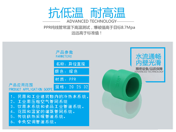 □ 管件連接牢固:由于聚丙烯具有良好的熱熔接性能,熱熔連接將同種材料制造的管材和管件連接成為一個整體,杜絕了漏水的隱患。