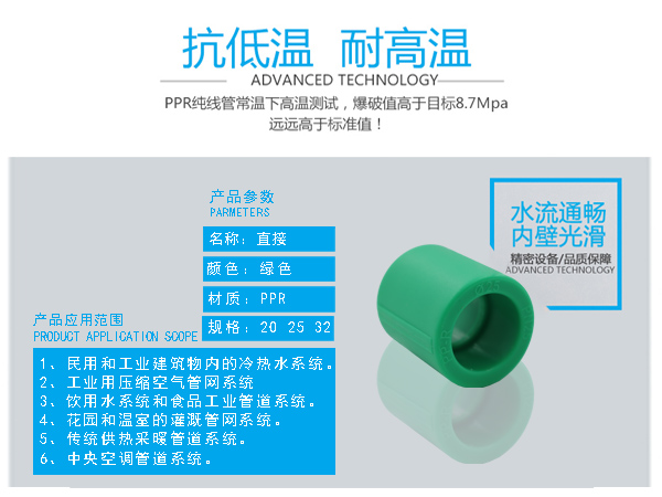 □ 管件連接牢固:由于聚丙烯具有良好的熱熔接性能,熱熔連接將同種材料制造的管材和管件連接成為一個(gè)整體,杜絕了漏水的隱患。