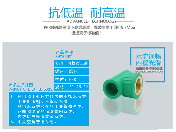 □ 耐熱性能好:瞬間使用水溫可達(dá)95℃。在水溫75℃可長(zhǎng)期使用,是一種較理想的室內(nèi)冷熱水管道。
