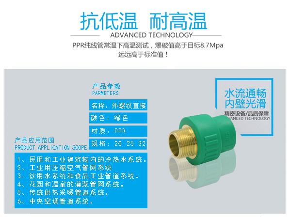 □ 配套齊全:PPR管道系統(tǒng)配套齊全,可以解決室內(nèi)和小區(qū)給水管道的工程配套要求。